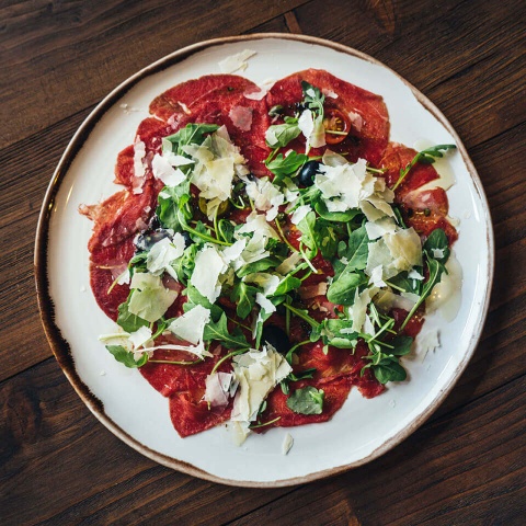 Carpaccio z polędwicy wołowej oliwa, balsamico, rukola, Grana Padano, kapary, oliwki 59 zł