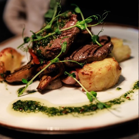 Ozor wołowy miód, musztarda, puree ziemniaczane, sos porowy, boczniak panierowany, chips z jarmużu 69 zł