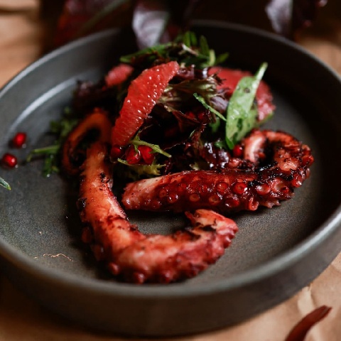 Burger z ośmiornicą sałata rzymska, ogórek marynowany, czosnkowe aioli 99 zł