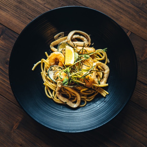 Pappardelle owoce morza krewetki, kalmary, małże Nowa Zelandia, czosnek, masło, wino 75 zł