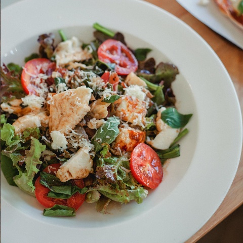 Sałatka Cezar kurczak, boczek, sałata rzymska, pomidorki, grzanka, Grana Padano, anchois 49 zł